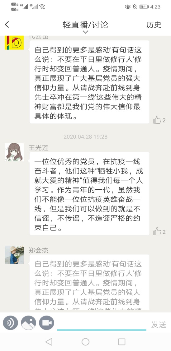 为进一步学习贯彻习近平总书记关于新冠肺炎疫情防控指示精神和党中央重大决策部署要求,充分发挥学生党支部的战斗堡垒作用和学生党员的先锋模范作用,助力打赢疫情防控阻击战。教育学院本科小学教育系第二党支部于2020年4月28晚上19:00在线上开展《习近平讲述的故事:疾风知劲草》主题活动学习。本次会议应到党员35人,其中正式党员12人,预备党员23人。会议由支部组织委员郑会杰主持。